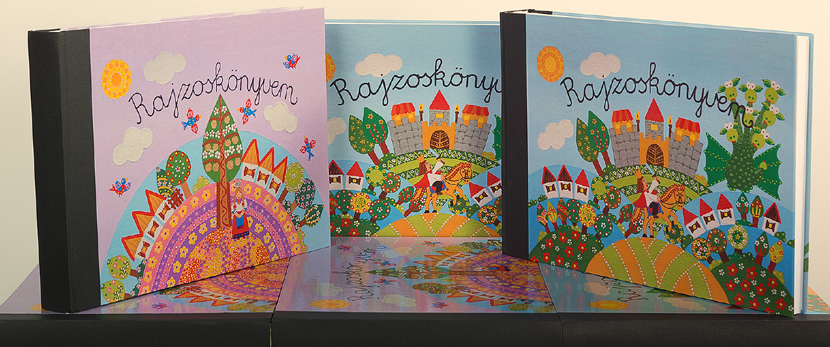 kézműves album akár 100 gyerekrajz részére extra nagy méret az A/4-es rajzoknak kétféle egyedi grafika a borítón Pleszkán Orsitól egyszerűen applikálhatók bele a meglévő rajzok gondos kézi kötészet,fólia csomagolás